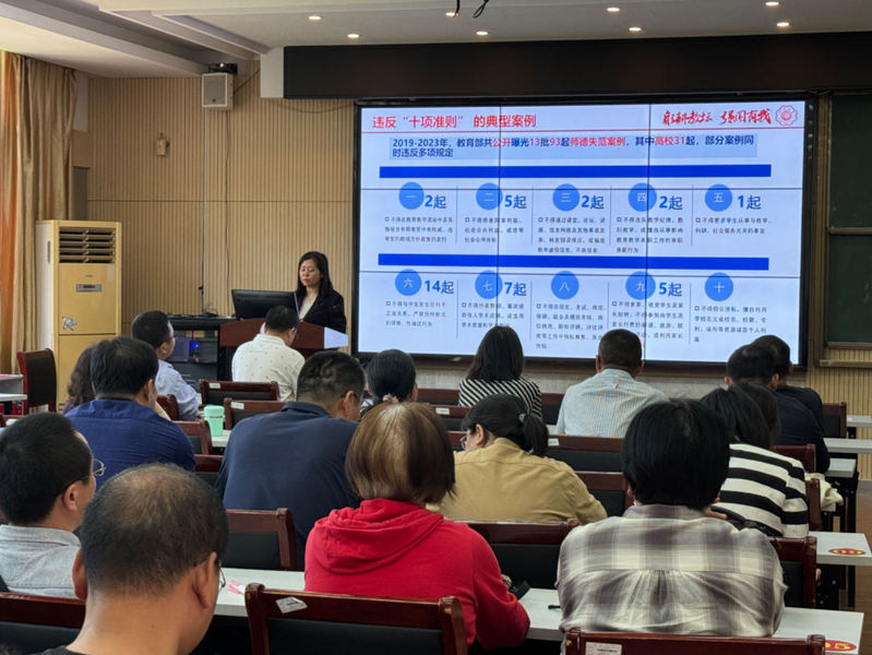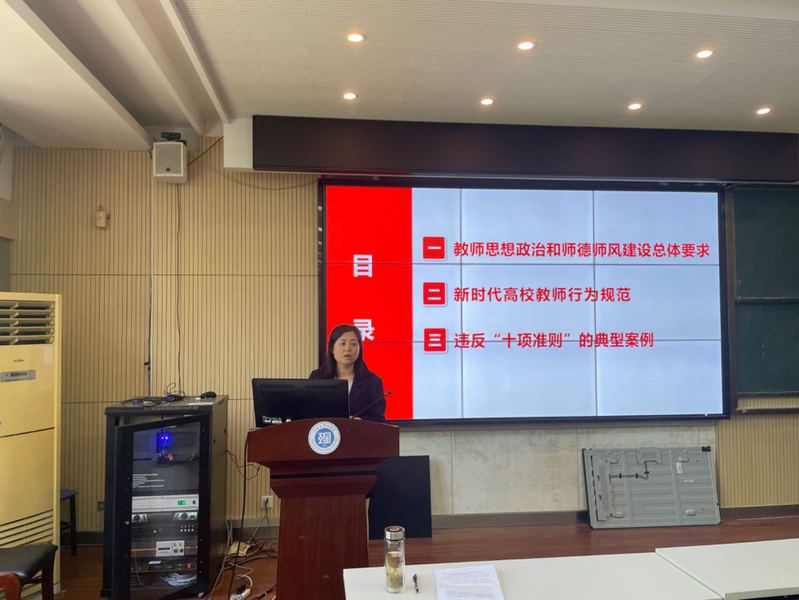 潘书记首先介绍了教师思想政治和师德师风建设的总体要求,随后详细解读了新时代高校教师行为规范,会上重点从党的纪律角度解读“十项准则”负面清单并以典型案例为反面教材开展了警示教育。