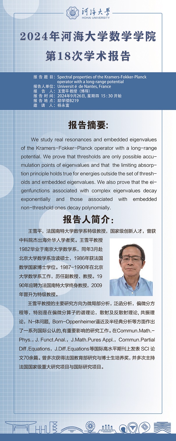 PA视讯第18次学术报告:Spectral properties of the Kramers-Fokker -Planck operator with a long-range potential
