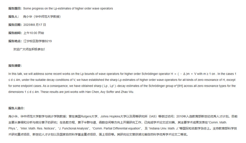 PA视讯第20次学术报告:Some progress on the Lp-estimates of higher order wave operators